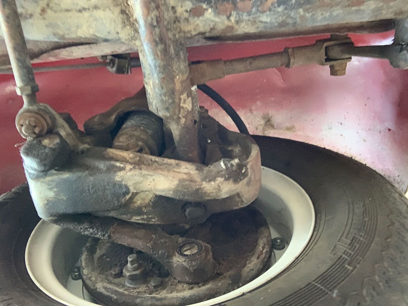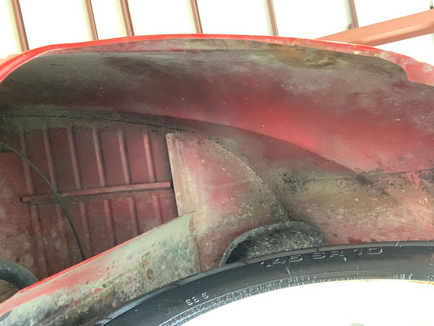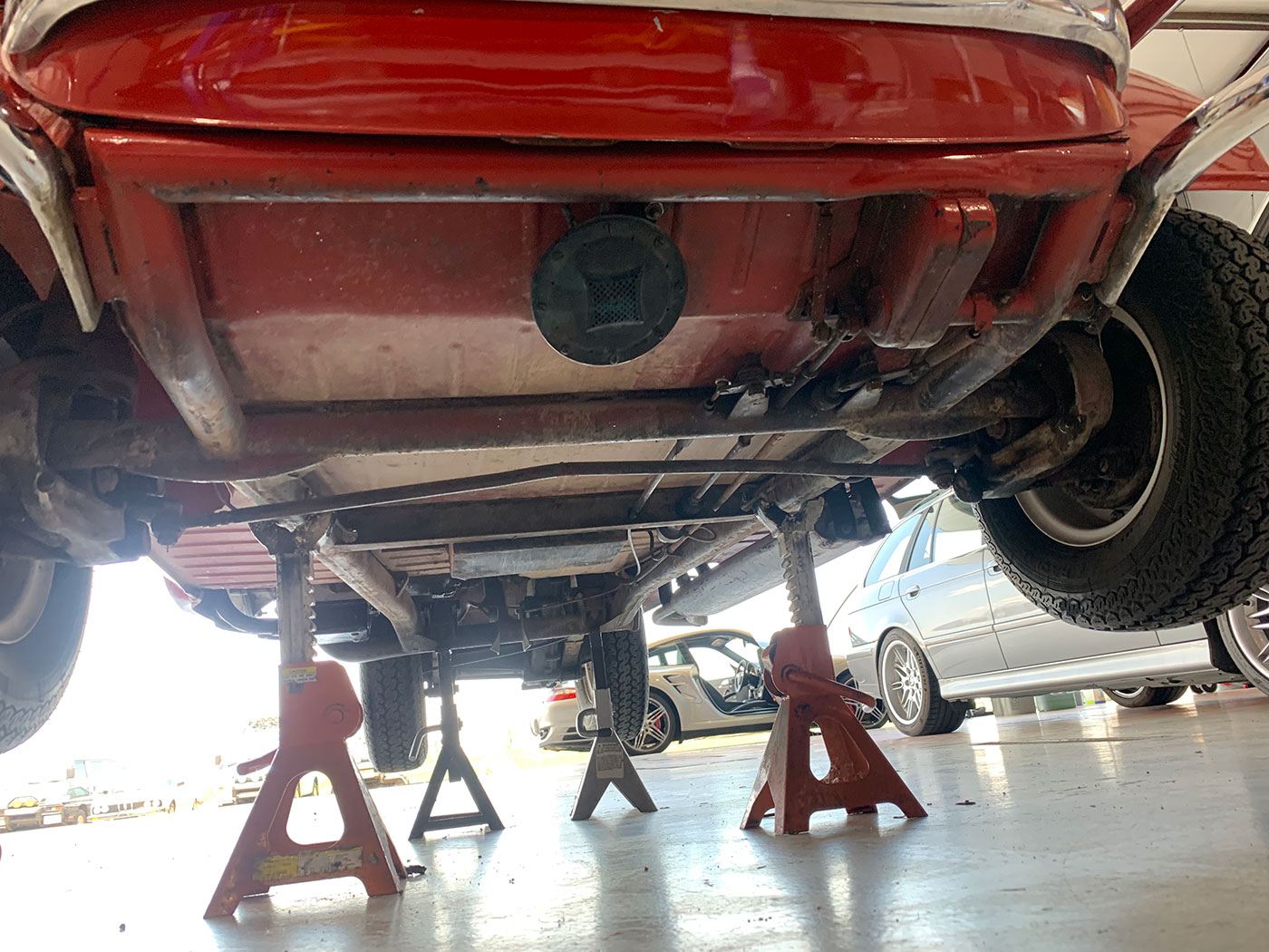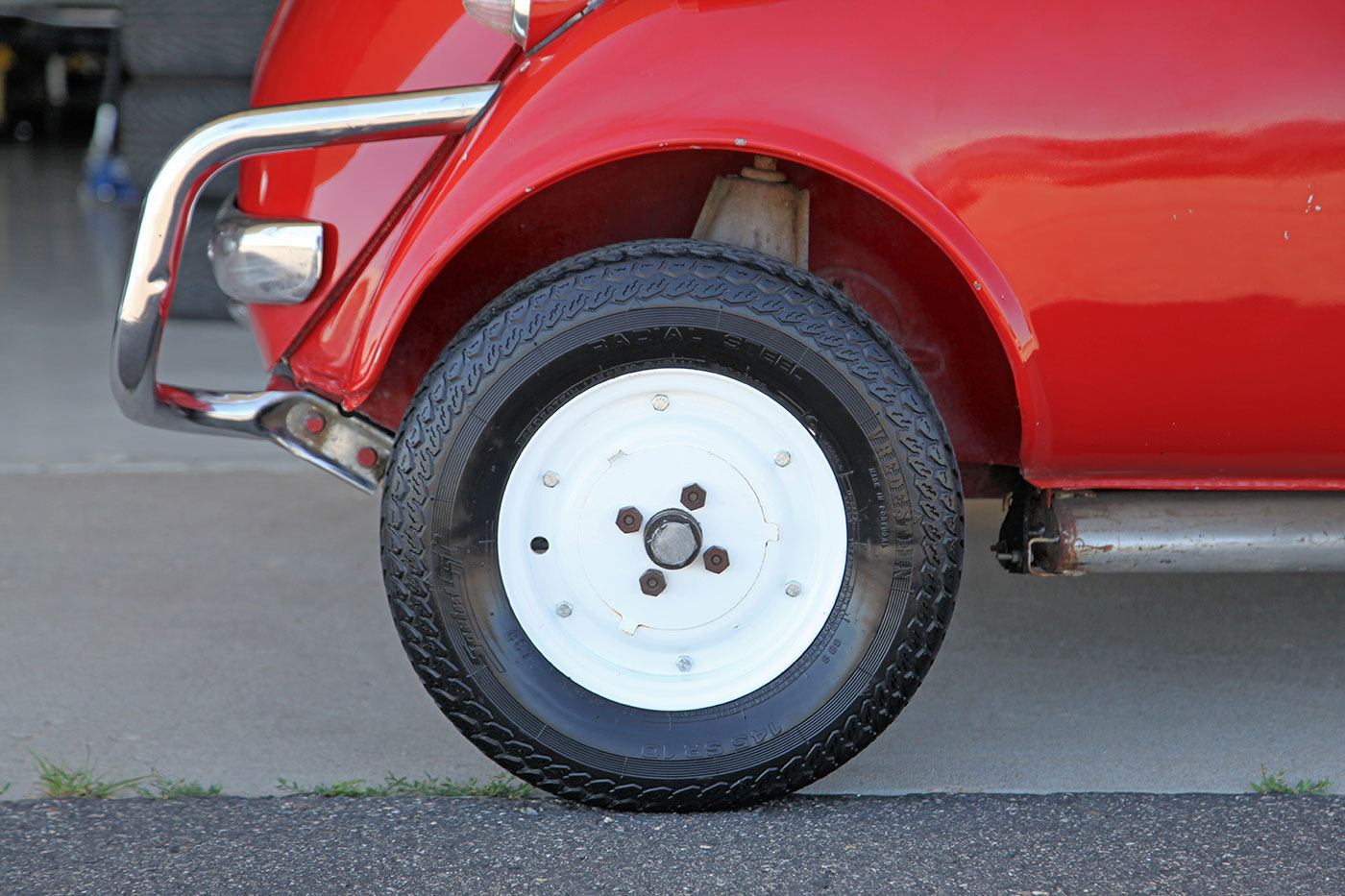 The Red paint is in fair condition, being an older repaint. It is presentable, but there are lots of small dings, chips, and cracks throughout the finish. There is also evidence of overspray on some of the rubber. The canvas sunroof is in good shape. It appears to be rust-free with the exception of the battery box (there are lift pictures on our website if you are reading this elsewhere). The VIN plate is intact. The chrome bumpers are in good shape, but the left rear portion where it connects to the body is missing a trim ring. There is a crease where the bumper connects the rear quarter panels on both sides. There are also what appear to be holes for bumperettes or something else on the rear bumper. The front bumper has a small vertical crease on the right hand side. All glass is crack-free, with the front glass having minor pitting. Both the front and rear window trim is shrunken, which results in a small gap at the bottom of the glass. The headlights, front indicators, and indicator lights are crack-free. The left indicator light is slightly more orange than the right. The brake light has a cracked lens. The wheels do not have hubcaps, and the right front hub has a broken wheel stud. The tires appear to be older, but have good tread remaining and no dry rot.