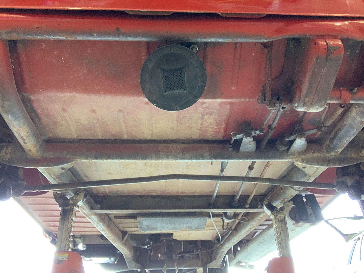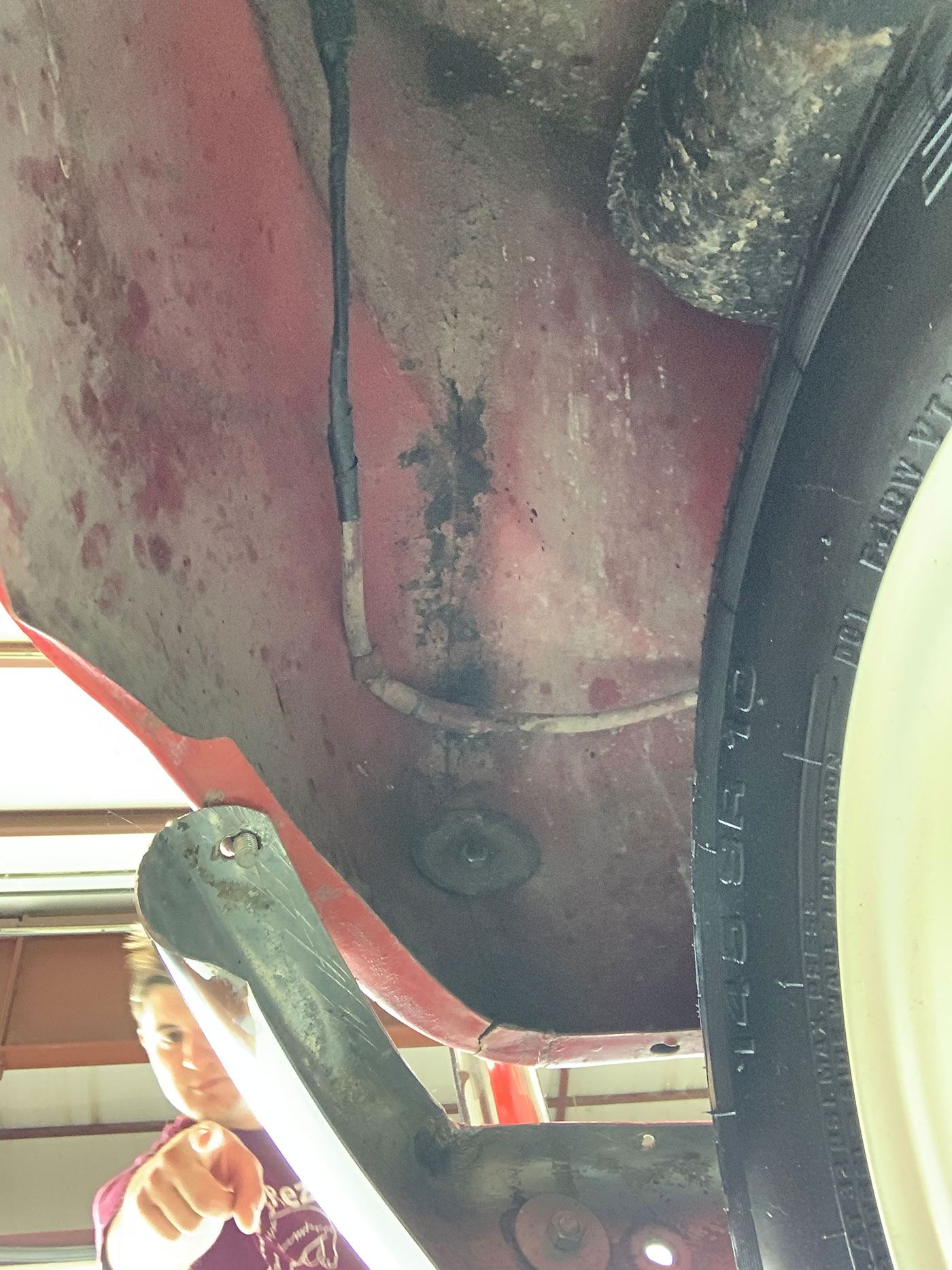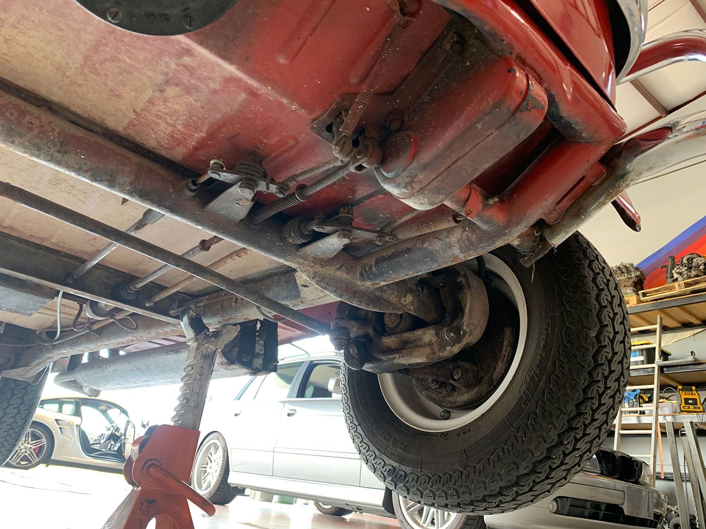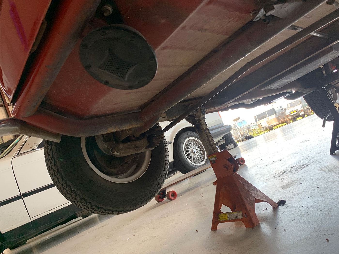 The Red paint is in fair condition, being an older repaint. It is presentable, but there are lots of small dings, chips, and cracks throughout the finish. There is also evidence of overspray on some of the rubber. The canvas sunroof is in good shape. It appears to be rust-free with the exception of the battery box (there are lift pictures on our website if you are reading this elsewhere). The VIN plate is intact. The chrome bumpers are in good shape, but the left rear portion where it connects to the body is missing a trim ring. There is a crease where the bumper connects the rear quarter panels on both sides. There are also what appear to be holes for bumperettes or something else on the rear bumper. The front bumper has a small vertical crease on the right hand side. All glass is crack-free, with the front glass having minor pitting. Both the front and rear window trim is shrunken, which results in a small gap at the bottom of the glass. The headlights, front indicators, and indicator lights are crack-free. The left indicator light is slightly more orange than the right. The brake light has a cracked lens. The wheels do not have hubcaps, and the right front hub has a broken wheel stud. The tires appear to be older, but have good tread remaining and no dry rot.