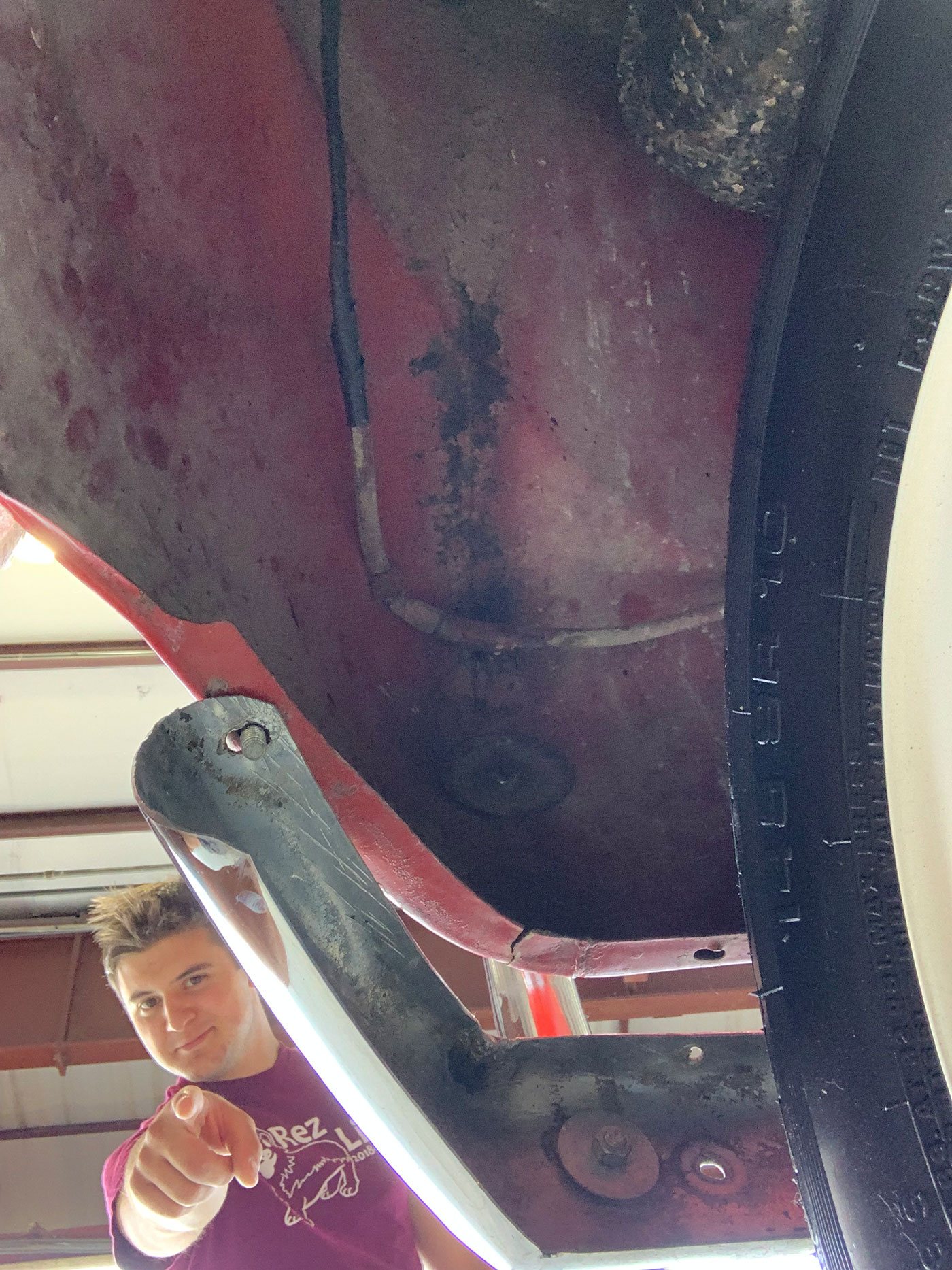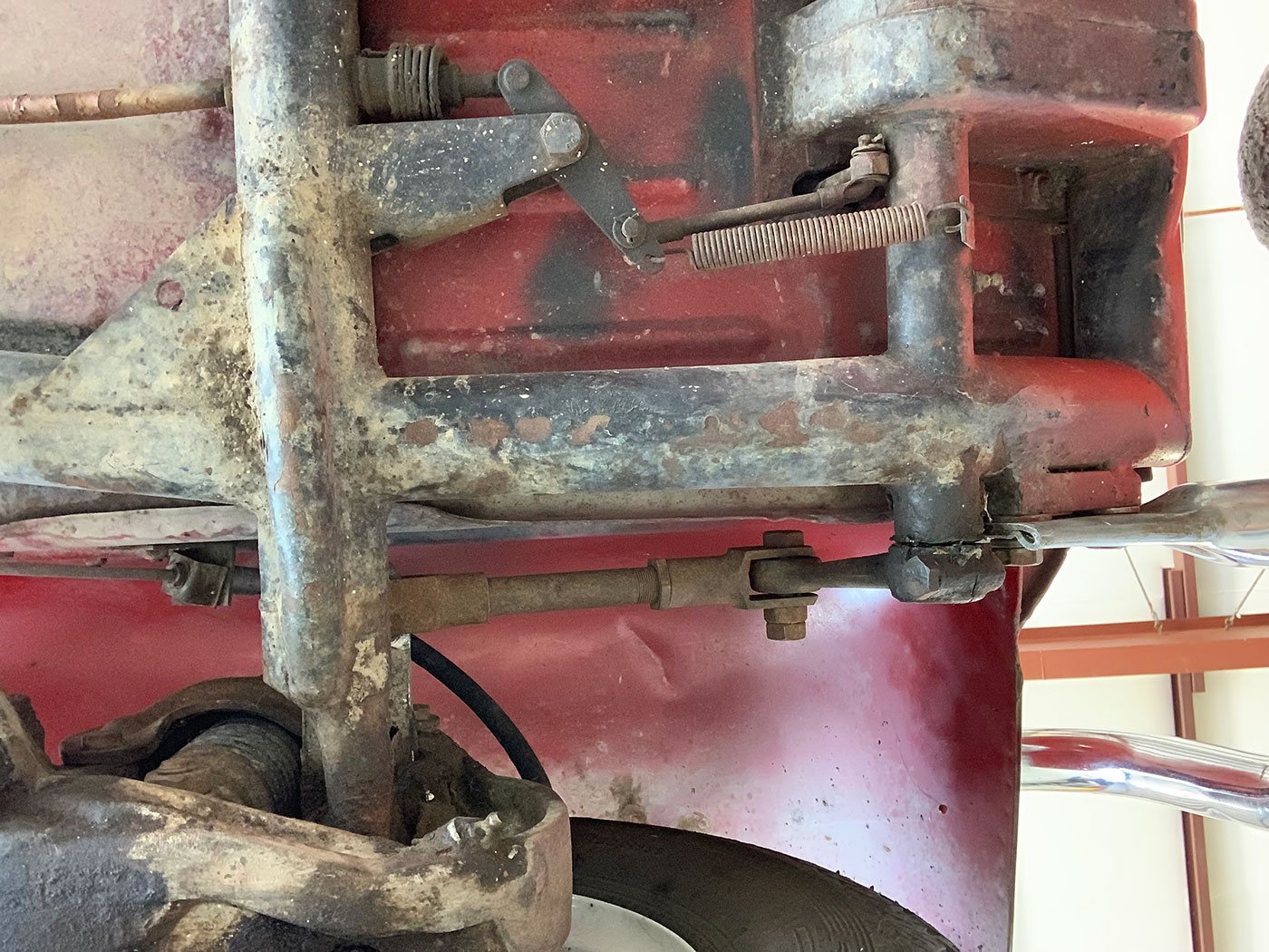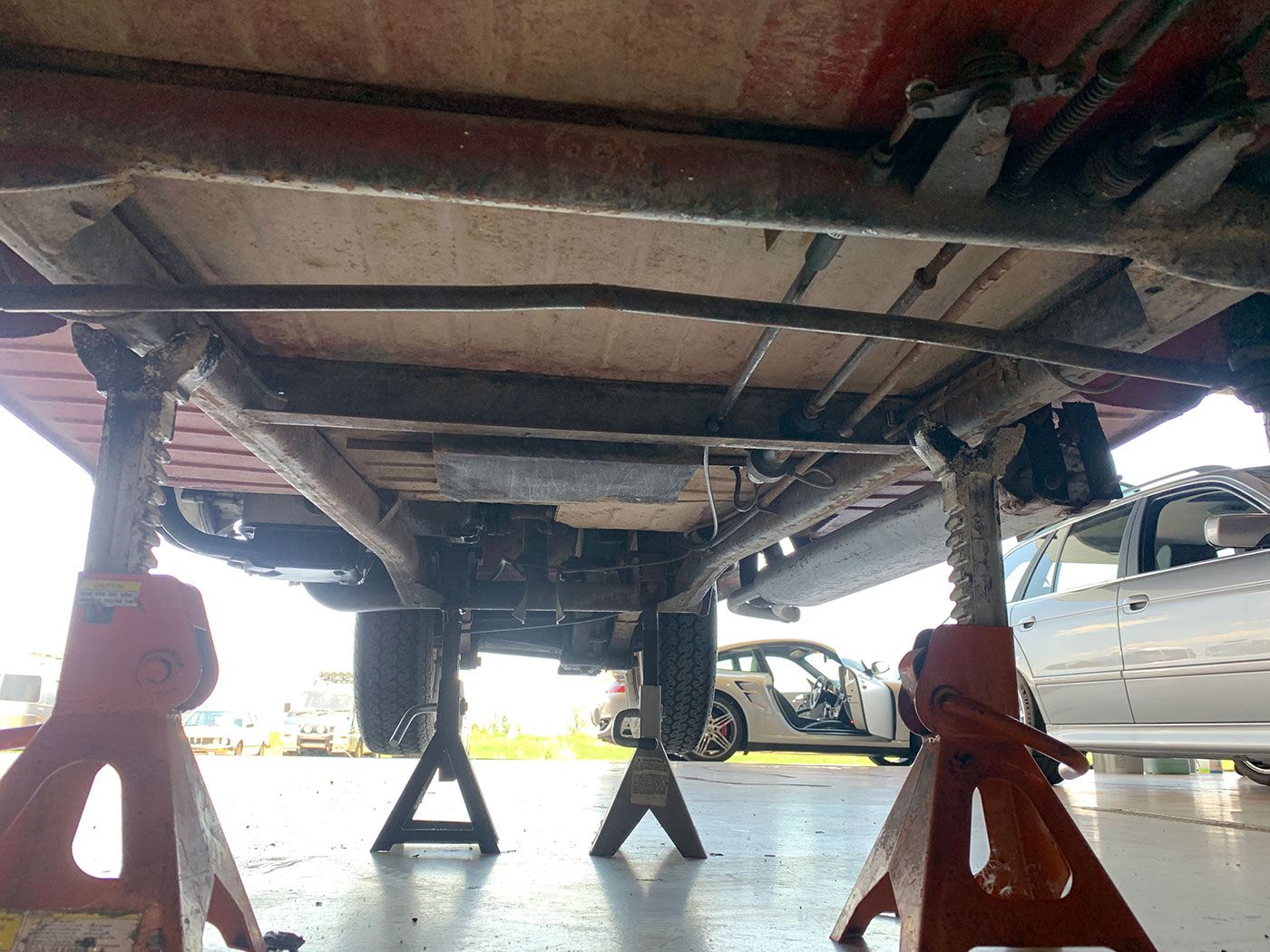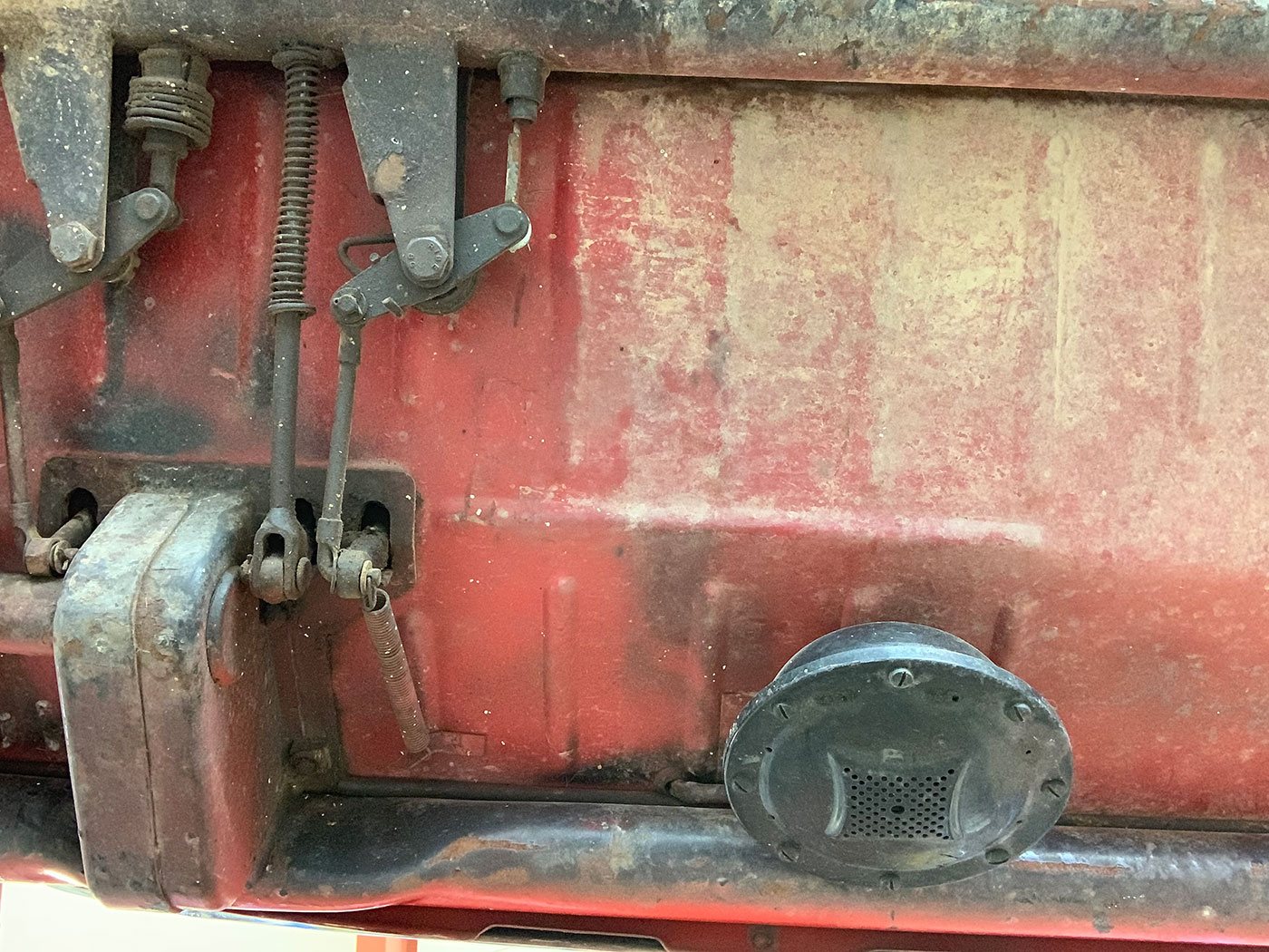 The Red paint is in fair condition, being an older repaint. It is presentable, but there are lots of small dings, chips, and cracks throughout the finish. There is also evidence of overspray on some of the rubber. The canvas sunroof is in good shape. It appears to be rust-free with the exception of the battery box (there are lift pictures on our website if you are reading this elsewhere). The VIN plate is intact. The chrome bumpers are in good shape, but the left rear portion where it connects to the body is missing a trim ring. There is a crease where the bumper connects the rear quarter panels on both sides. There are also what appear to be holes for bumperettes or something else on the rear bumper. The front bumper has a small vertical crease on the right hand side. All glass is crack-free, with the front glass having minor pitting. Both the front and rear window trim is shrunken, which results in a small gap at the bottom of the glass. The headlights, front indicators, and indicator lights are crack-free. The left indicator light is slightly more orange than the right. The brake light has a cracked lens. The wheels do not have hubcaps, and the right front hub has a broken wheel stud. The tires appear to be older, but have good tread remaining and no dry rot.