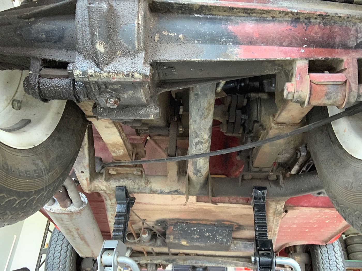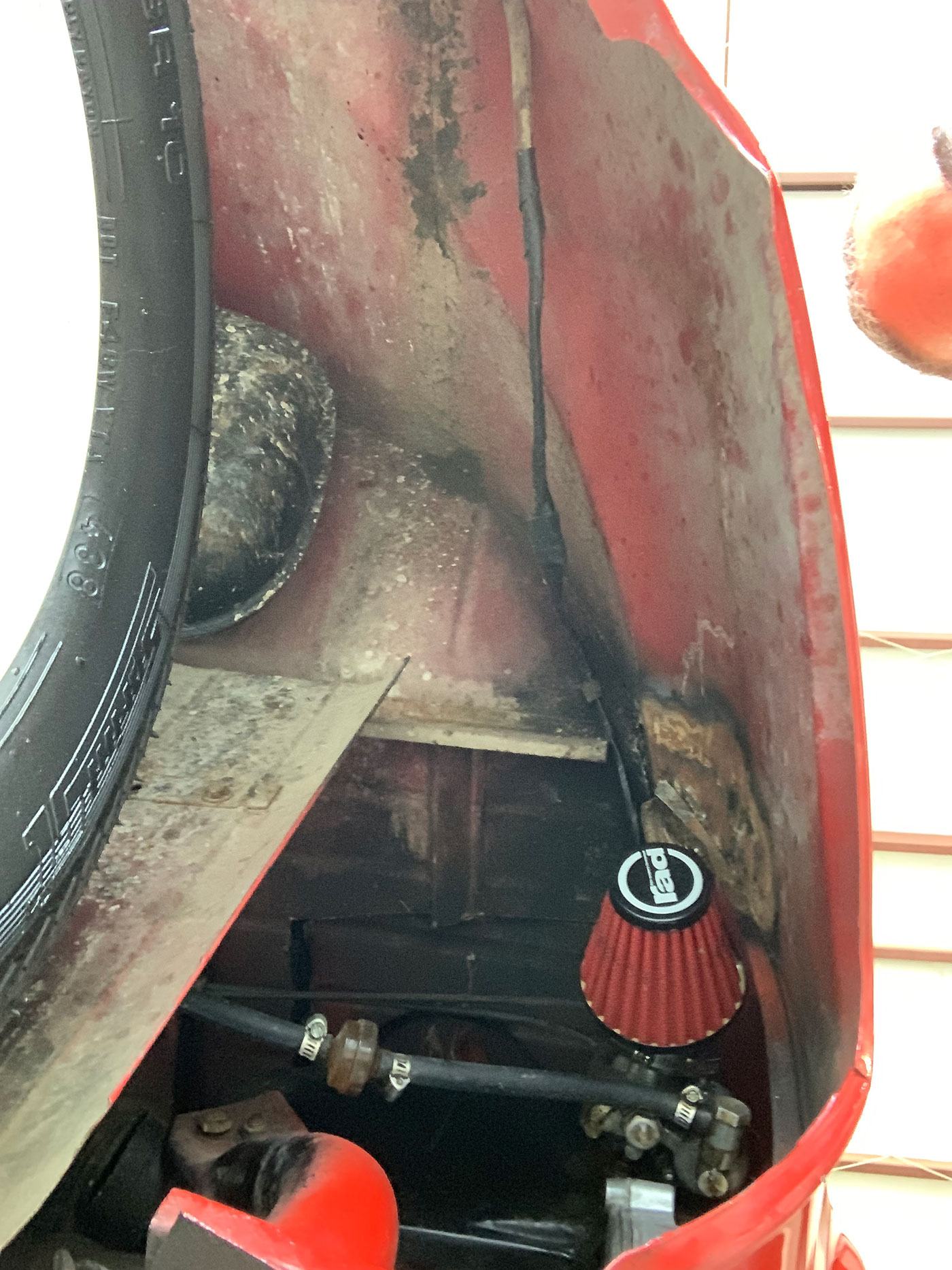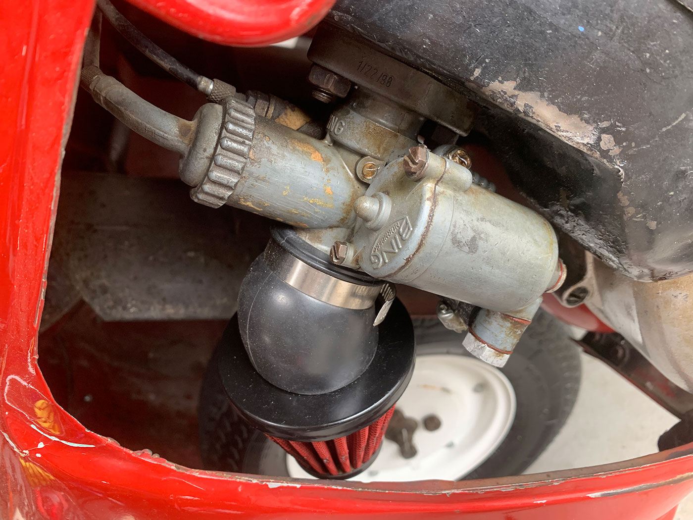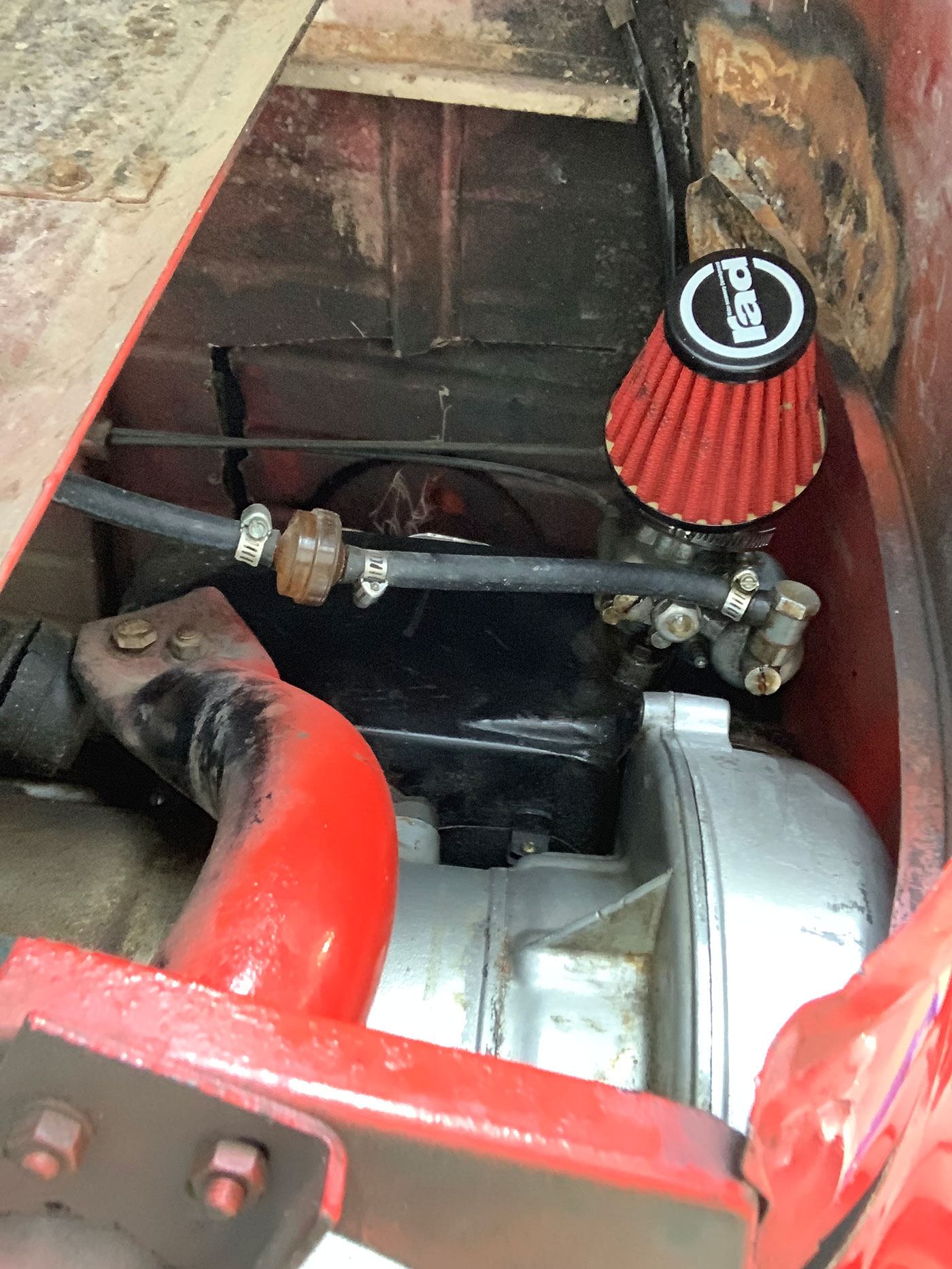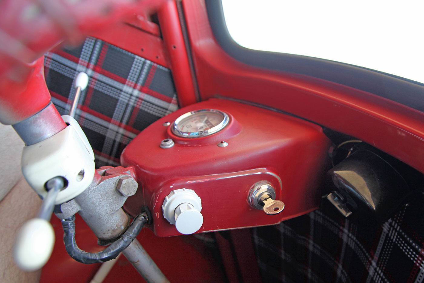 The interior is in better nick than the exterior. It appears to have been refinished at some point with black, white, and red plaid trim. There is no headliner, but the underside of the canvas sunroof is in good shape. The steering wheel is wrapped in red leather, and appears to have red overspray on the spokes. The speedometer works, as do the turn signals, headlights, and wiper. The turn signal indicator bulb is INOP and the wiper arm has no blade. The horn has been relocated with an aftermarket switch, but it looks correct. There is lots of shoddy wiring around the cluster that could be easily cleaned up. The heat works, not that you’ll need it with the greenhouse effect! The seat appears to have been recovered in red vinyl with white piping and is in good shape. The black floor and rear shelf carpet is also in good shape. It comes with two keys, but no owners’ manuals.
